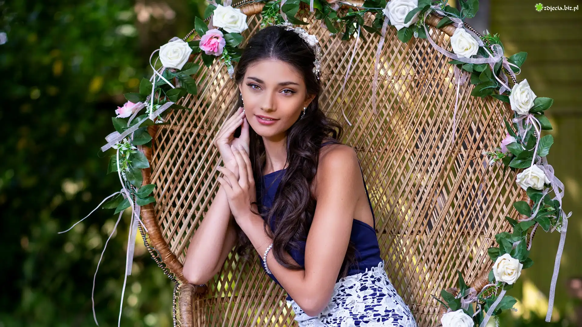 Zdjęcie Kobieta, Wiklinowy, Fotel, Kwiatki