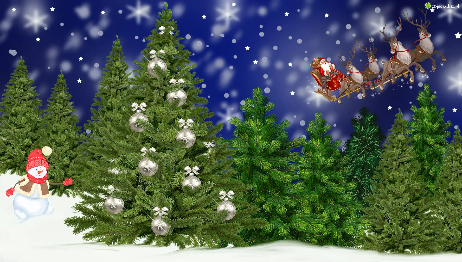 Zdjęcie Zima, Las, Drzewa, Choinka, Bałwanek, Mikołaj, Sanie, Renifery, Grafika 2D