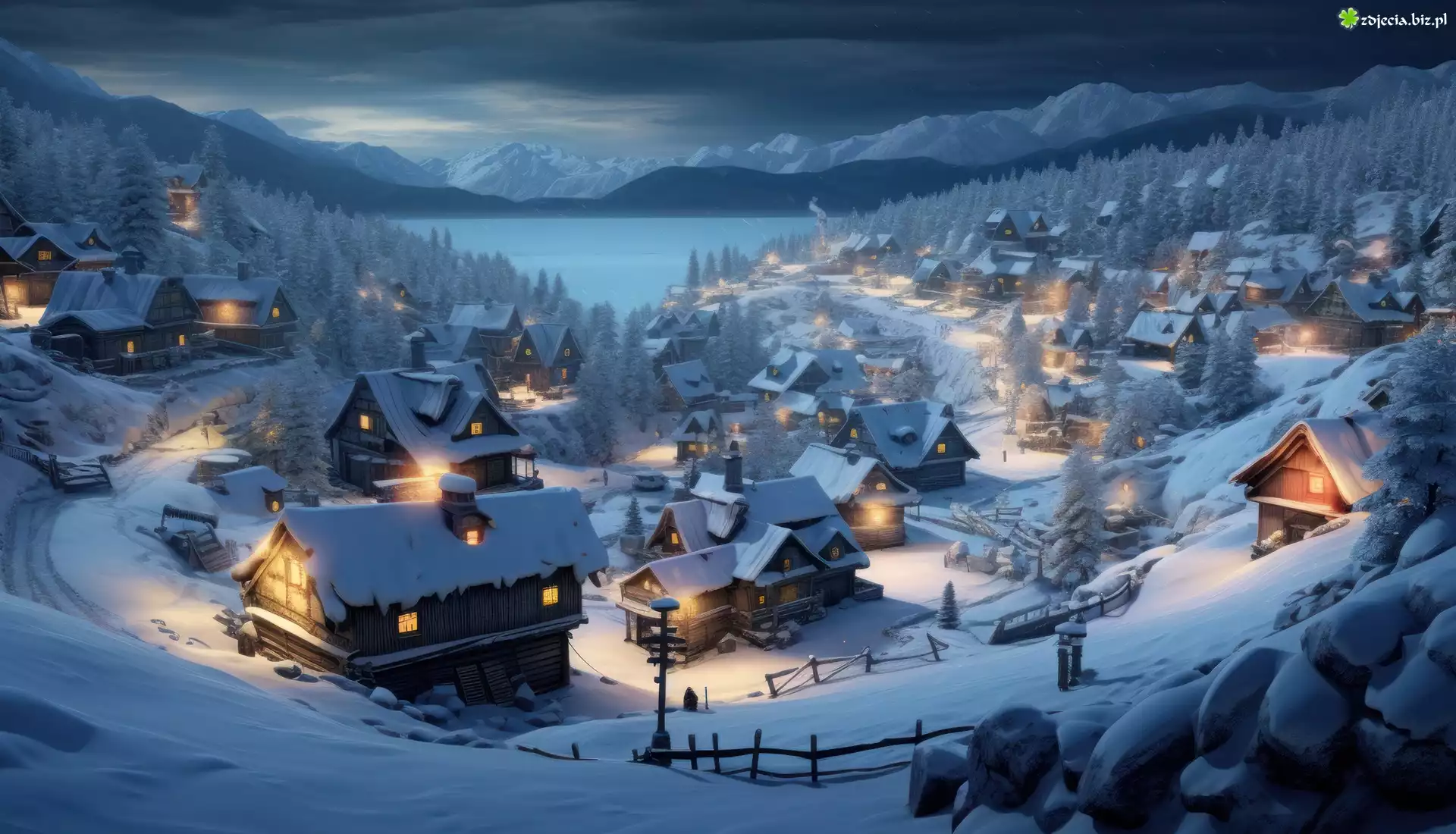 Zdjęcie Zima, Góry, Domy, Jezioro, Światła, Noc, Drzewa, 2D