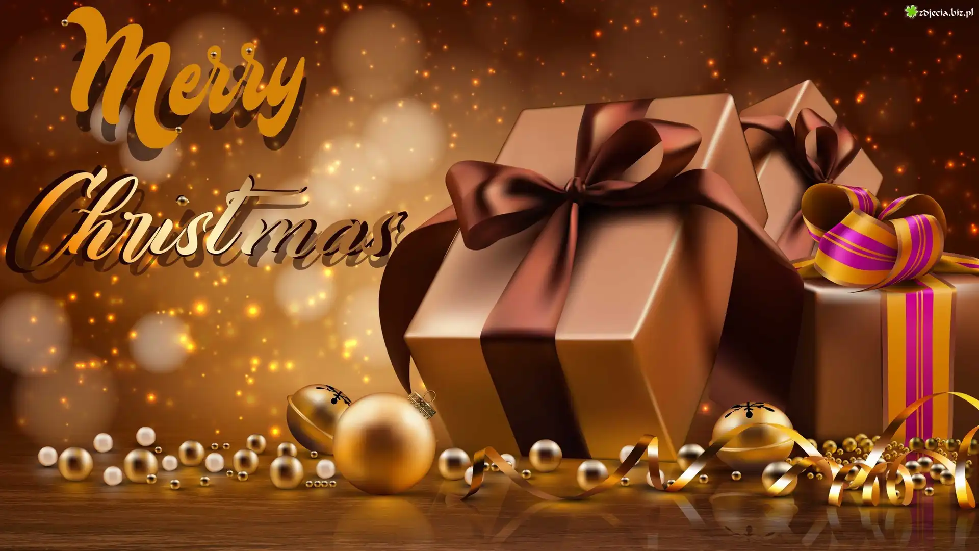 Zdjęcie Boże Narodzenie, Prezenty, Bombki, Napis, Merry Christmas, Wstążki, 2D