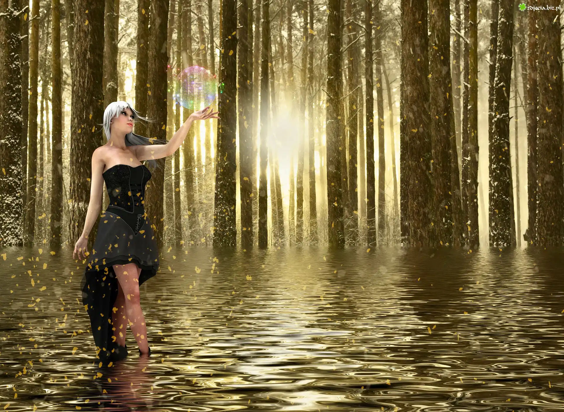 Zdjęcie Las, Drzewa, Woda, Dziewczyna, Czarna, Suknia, Kula, Blask, 2D
