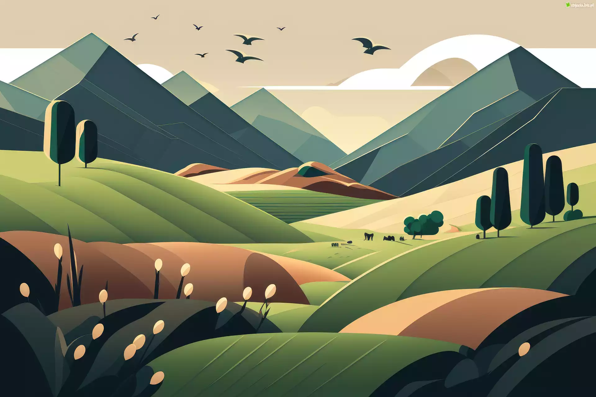 Zdjęcie Lato, Zielone, Wzgórza, Łąka, Drzewa, Kwiaty, Ptaki, 2D