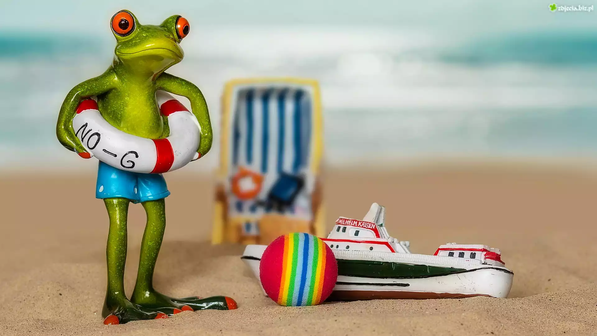 Zdjęcie Żaba, Koło ratunkowe, Piłka, Plaża, Piasek, Kompozycja