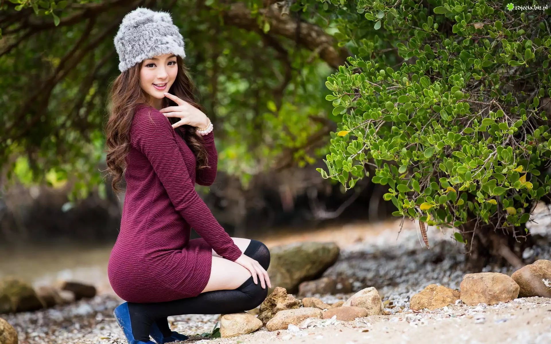 Zdjęcie Ładna, Dziewczyna, Azjatka, Czapka, Bordowe, Ubranie