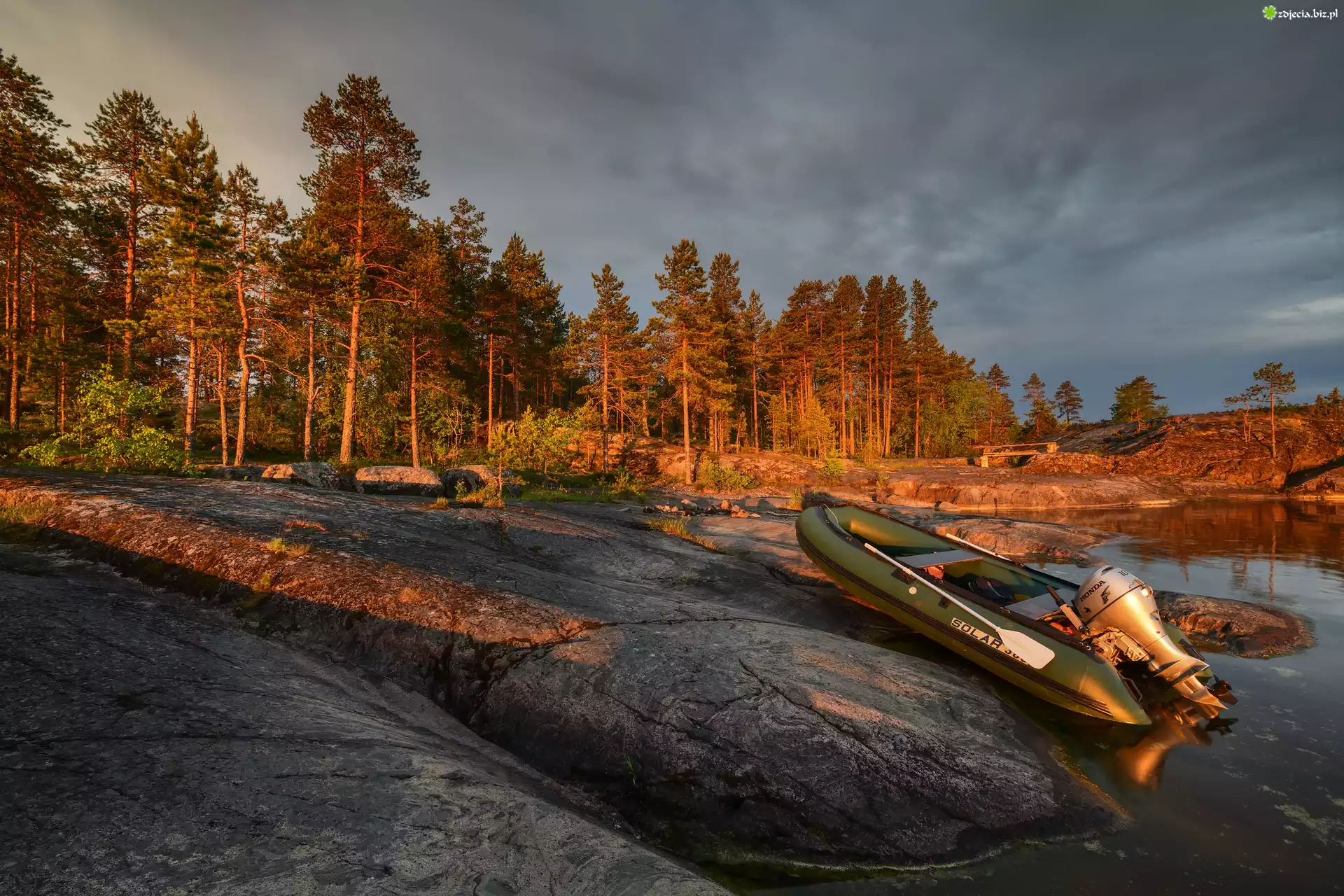 Zdjęcie Jezioro Ładoga, Łódka, Las, Drzewa, Skały, Karelia, Rosja