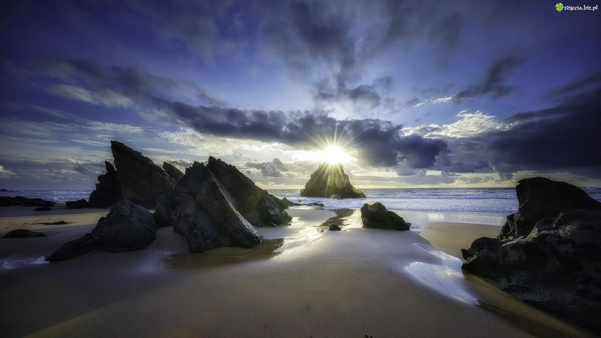 Zdjęcie, Portugalia, Adraga, Plaża, Morze, Skały, Wschód słońca