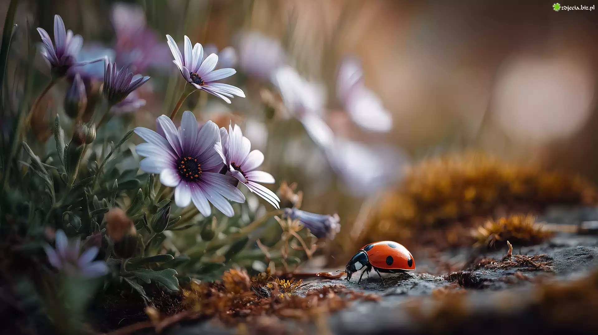 Zdjęcie, Fioletowe, Kwiaty, Stokrotki afrykańskie, Biedronka, Grafika AI