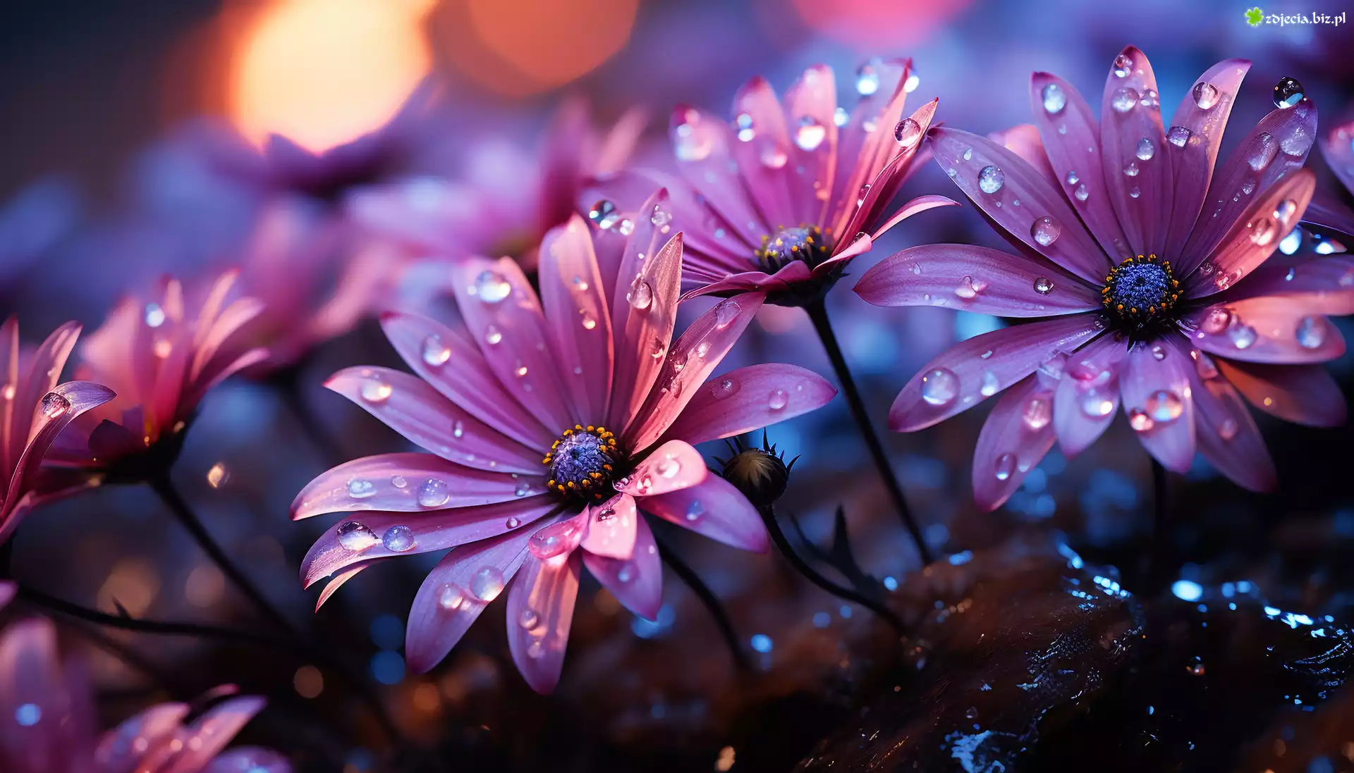 Zdjęcie Fioletowe, Kwiaty, Stokrotki afrykańskie, Krople, Światło, Grafika