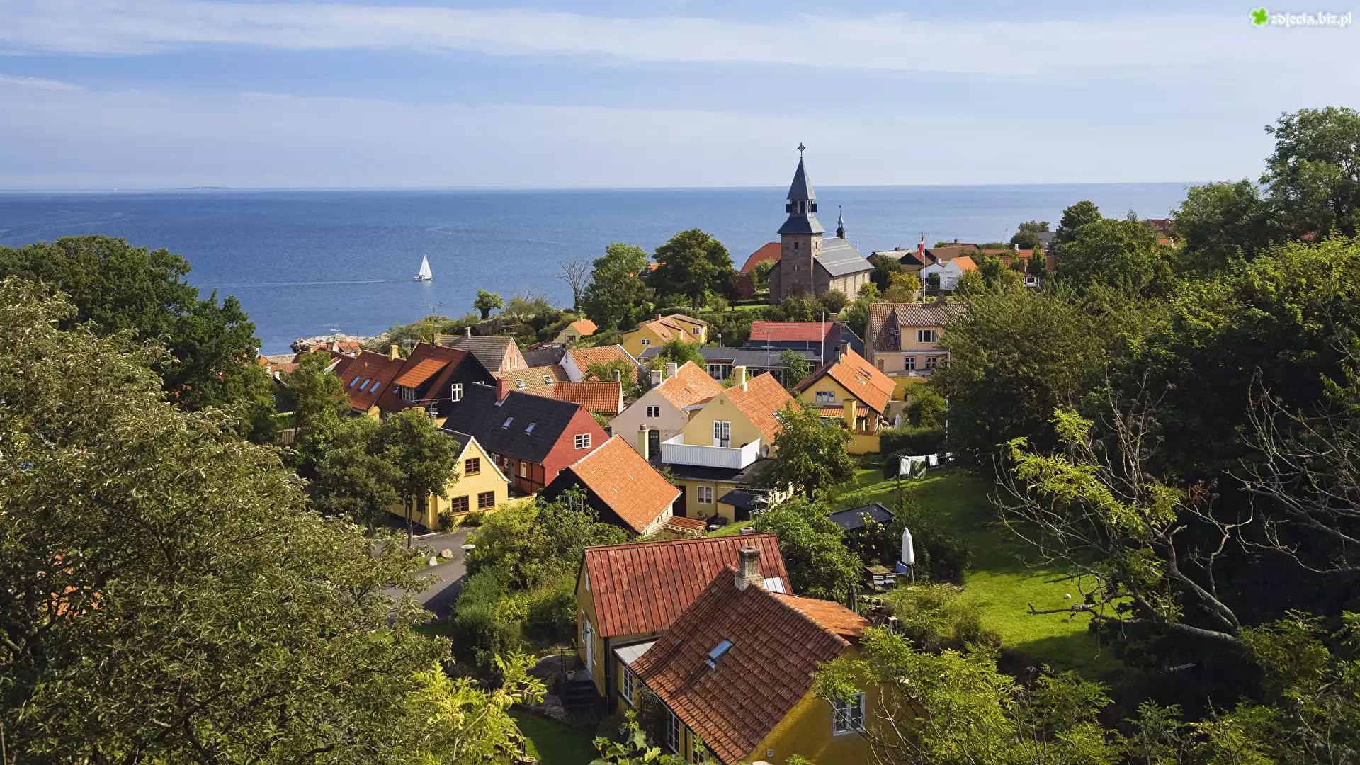 Zdjęcie Dania, Wyspa Bornholm, Miasto Gudhjem, Domy, Kościół, Drzewa, Morze, Żaglówka