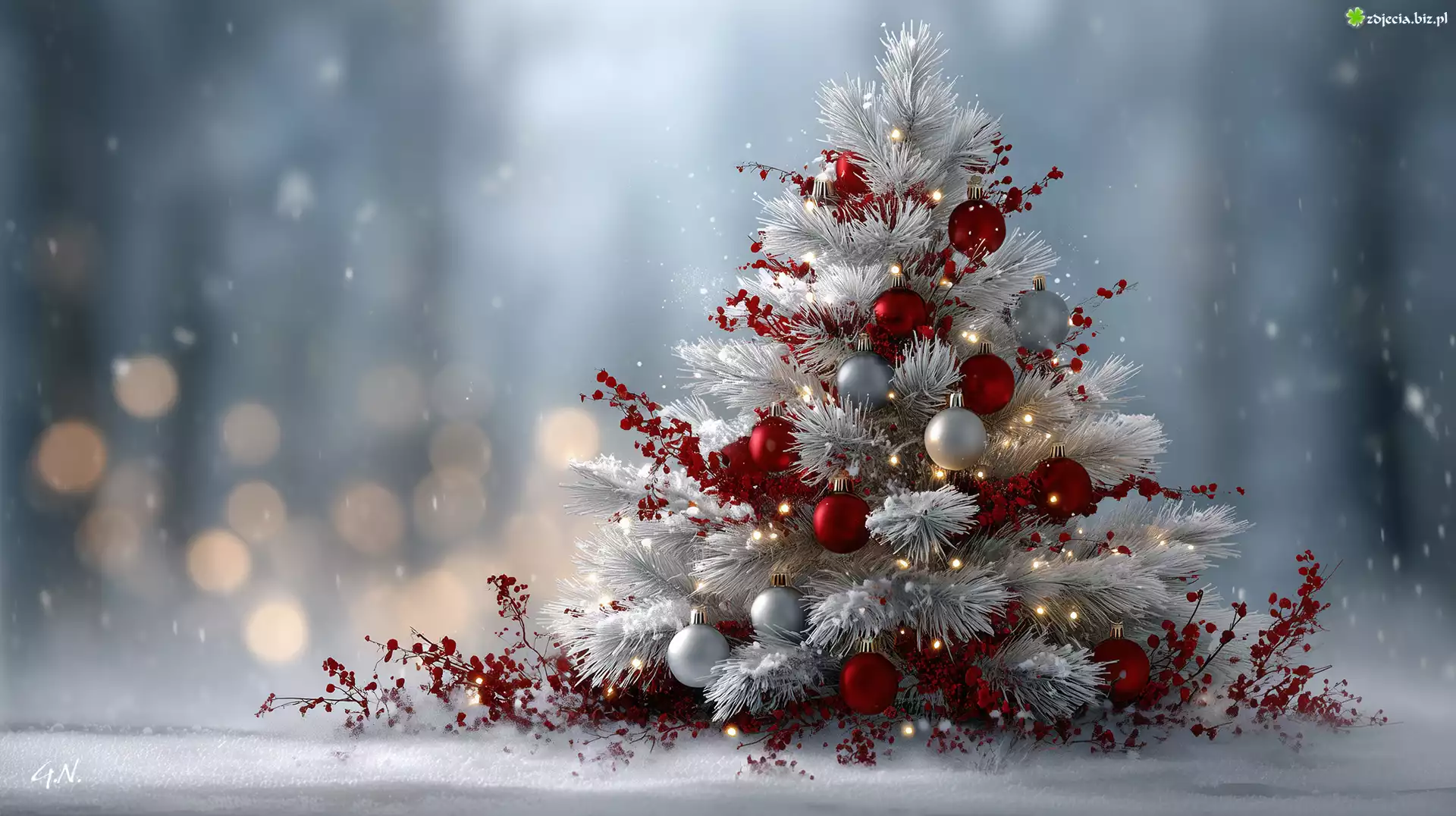 Zdjęcie Boże Narodzenie, Choinka, Białe, Czerwone, Bombki, Grafika AI