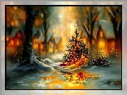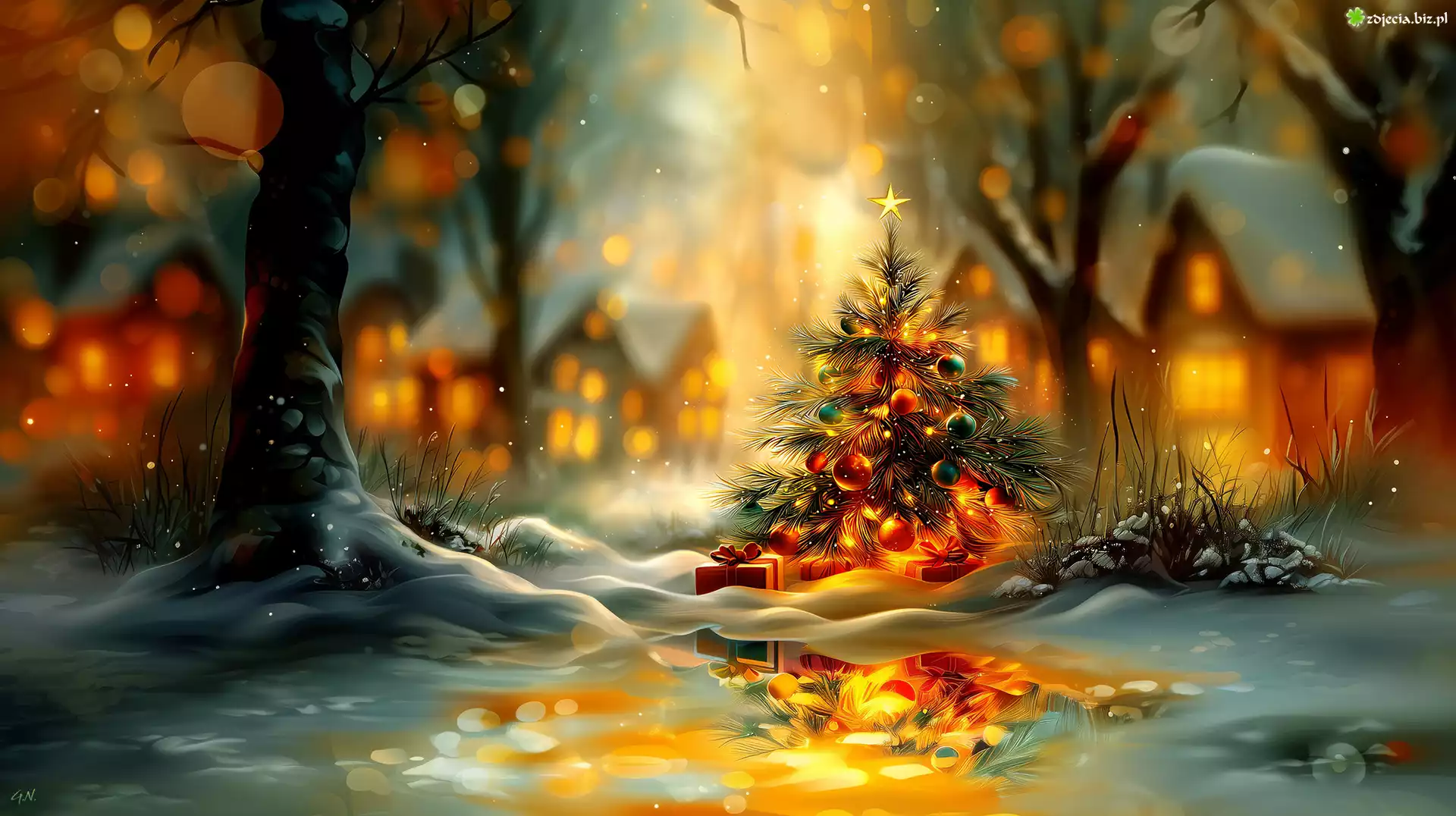 Zdjęcie, Boże Narodzenie, Choinka, Domy, Prezenty, Zima, Grafika AI