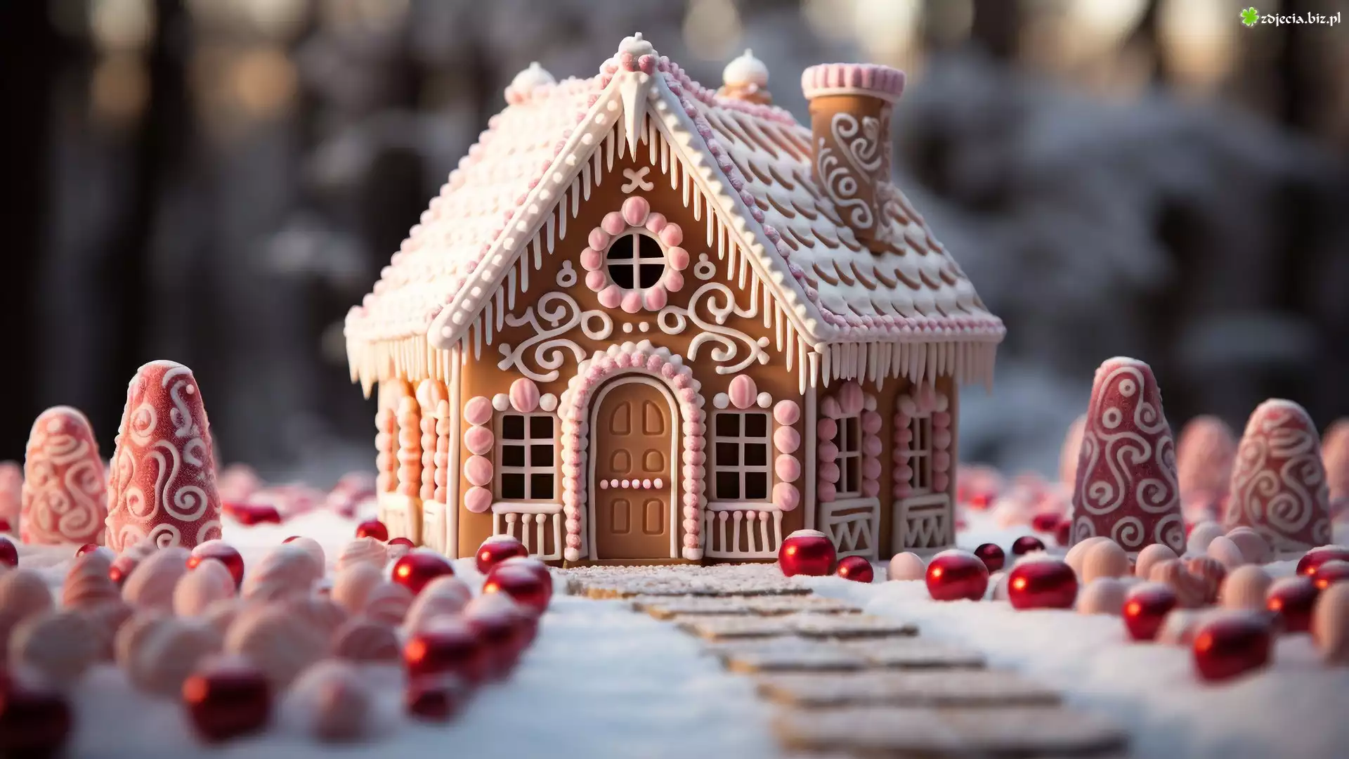 Zdjęcie, Pierniki, Udekorowany, Domek, Stożki, Czerwone, Białe, Kule, AI