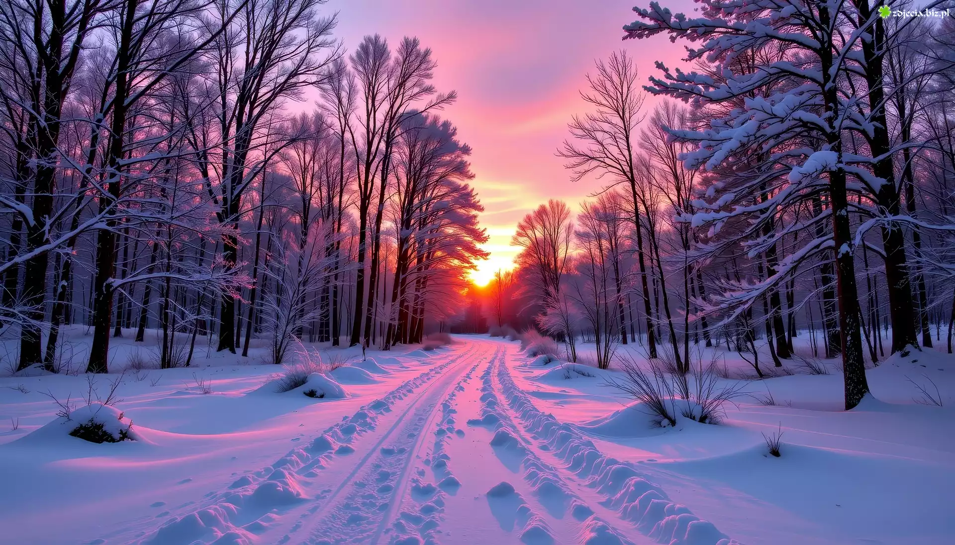 Zdjęcie Zima, Droga, Drzewa, Las, Zachód słońca, Grafika AI