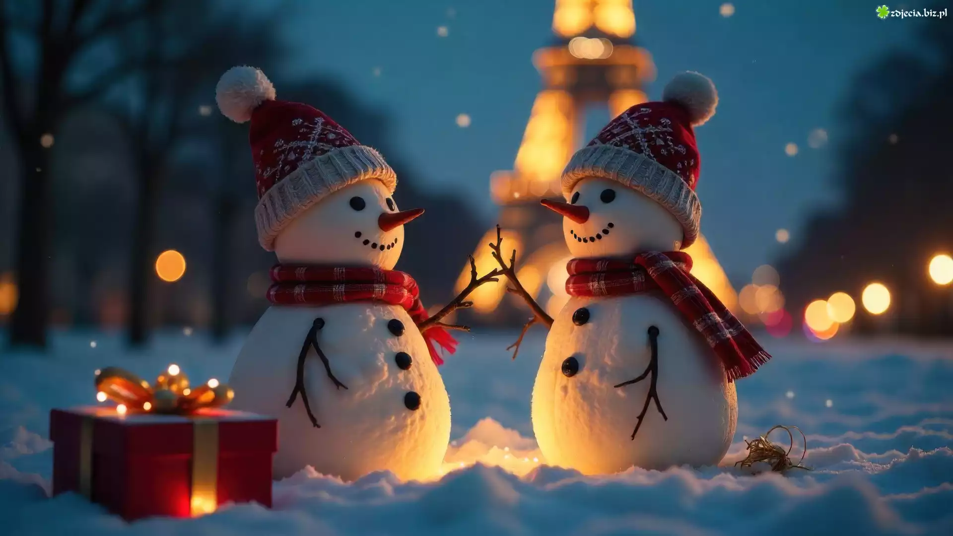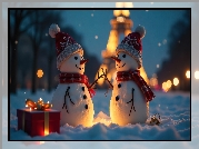 Zdjęcie Zima, Śnieg, Dwa, Bałwany, Czapki, Szaliki, Prezent, AI