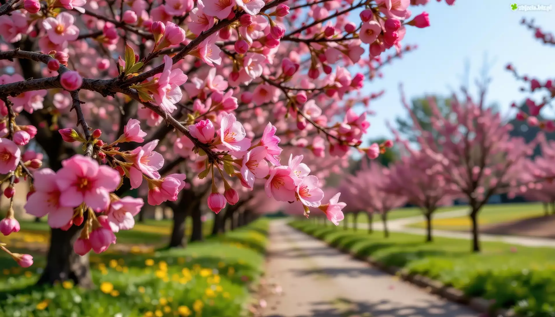 Zdjęcie Kwiaty, Różowe, Gałąź, Aleja, Drzewo owocowe, Grafika AI