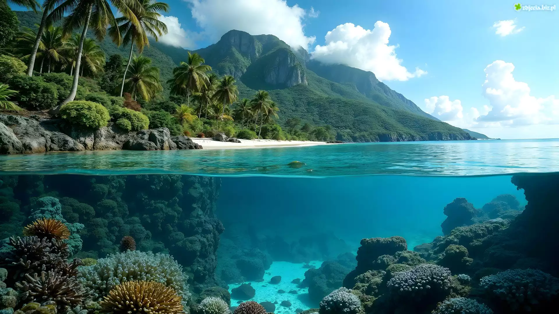 Zdjęcie, Morze, Plaża, Góry, Palmy, Skały, Rafa koralowa, AI