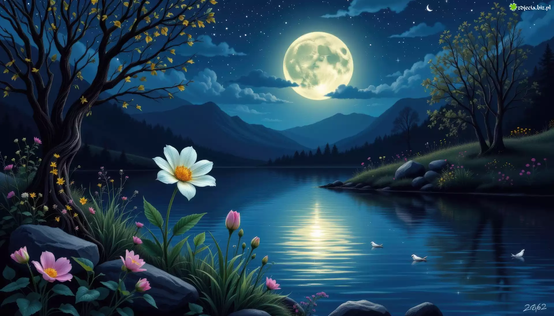 Zdjęcie Kwiaty, Drzewa, Jezioro, Księżyc, Noc, Góry, Grafika AI