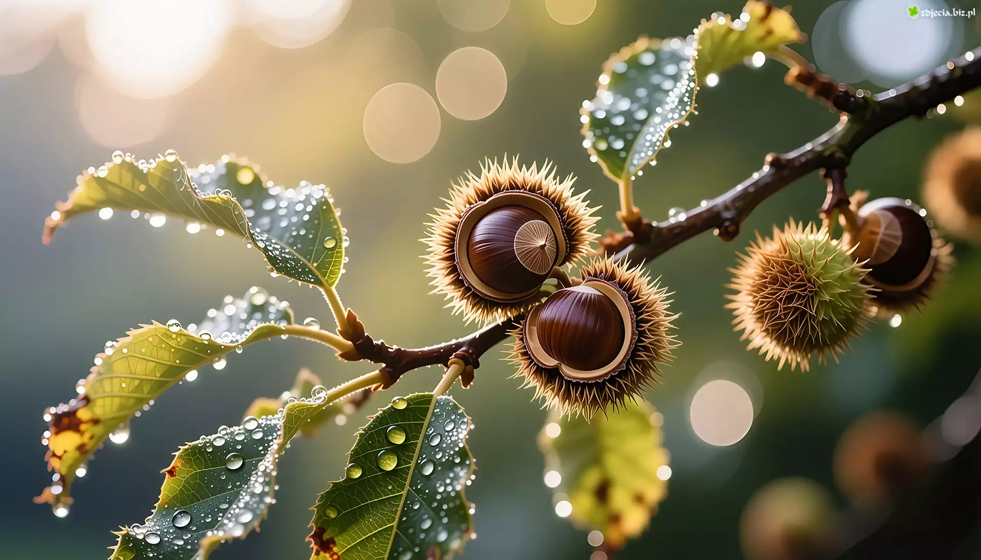 Zdjęcie Kasztan jadalny, Kasztany, Gałązka, Krople, Liście, Grafika AI