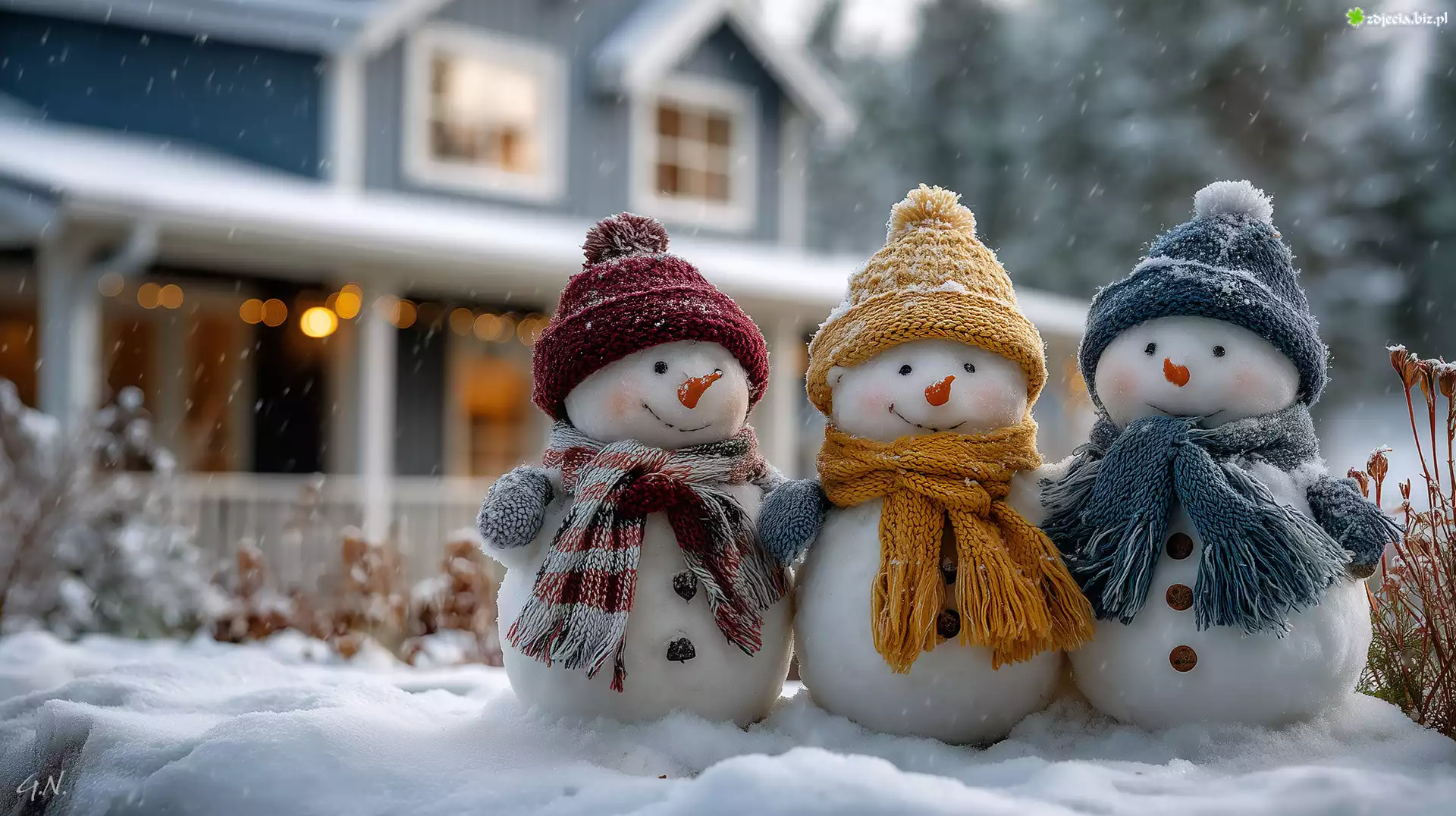 Zdjęcie Trzy, Bałwanki, Kolorowe, Czapki, Szaliki, Zima, Grafika AI