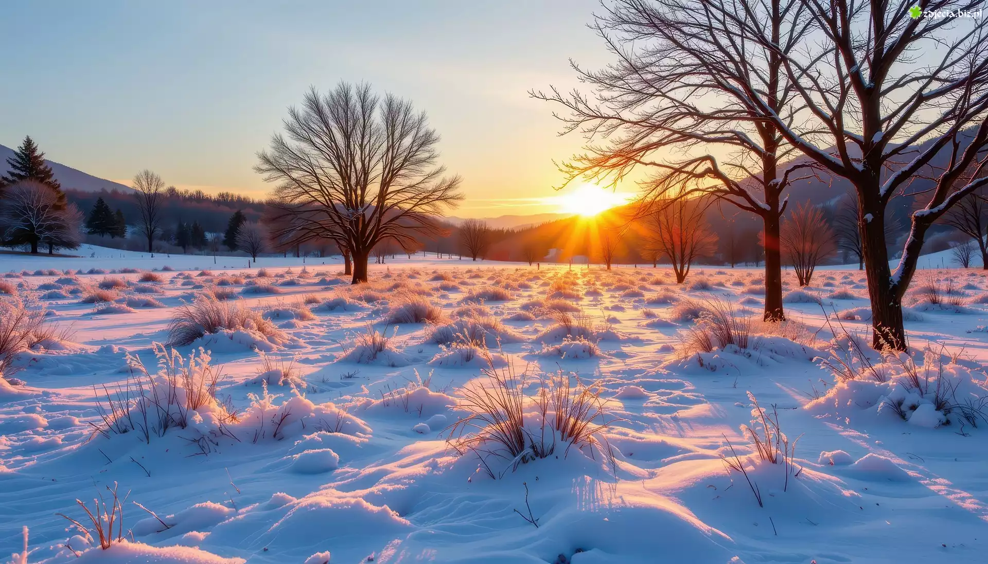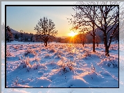 Zdjęcie Zima, Ośnieżona, Łąka, Drzewa, Wschód słońca, Grafika AI