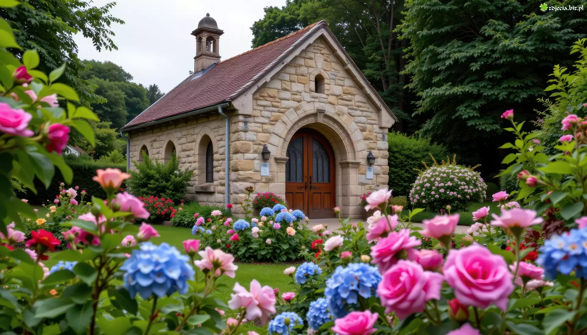 Zdjęcie, Budynek, Dom, Ogród, Róże, Hortensje, Drzewa, Grafika AI