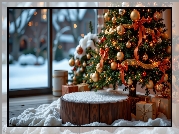 Zdjęcie, Choinka, Śnieg, Podium, Okno, Boże Narodzenie, Grafika AI