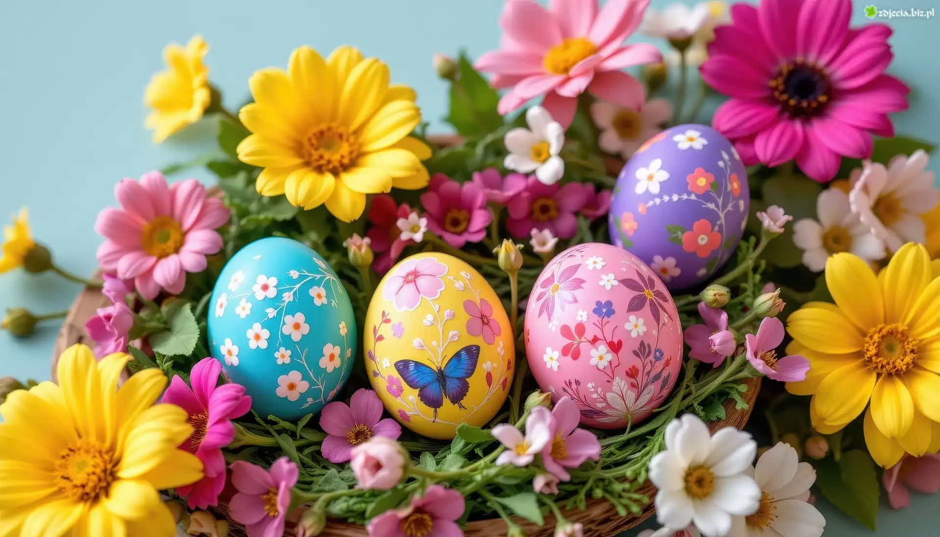Zdjęcie Kolorowe, Pisanki, Różowe, Żółte, Kwiaty, Wielkanoc, Grafika AI