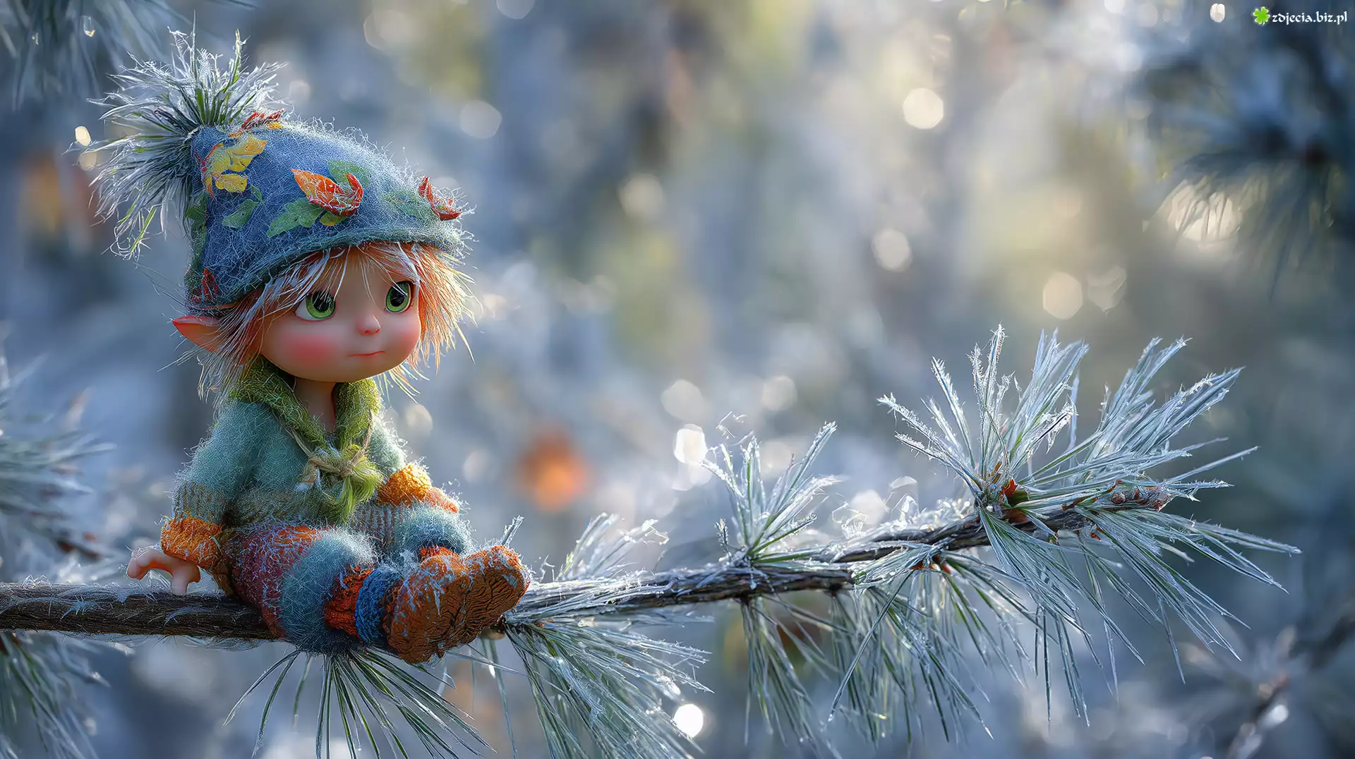 Zdjęcie Skrzat, Kolorowe, Ubranko, Gałązka, Sosna, Szron, Grafika AI