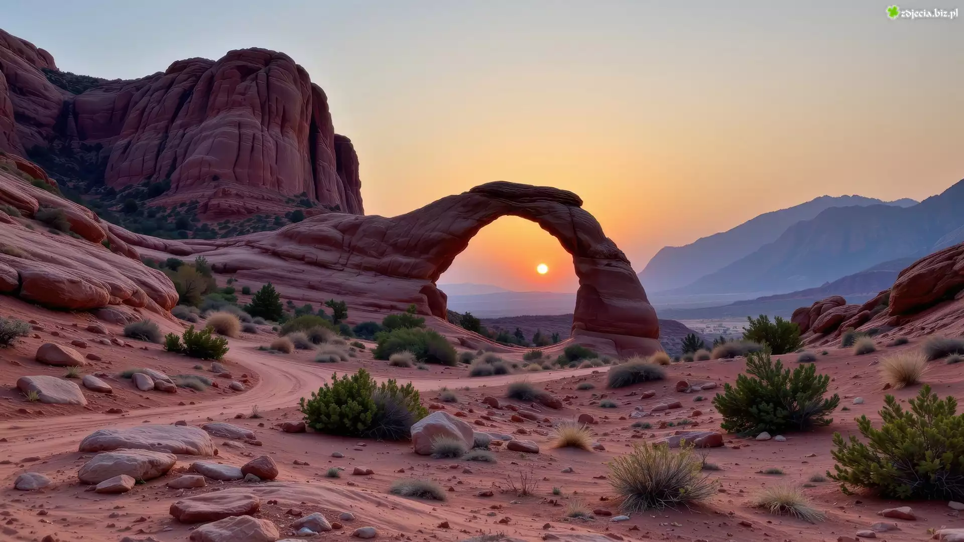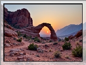 Zdjęcie, Skały, Łuk, Wschód słońca, Góry, Rośliny, Kamienie, AI