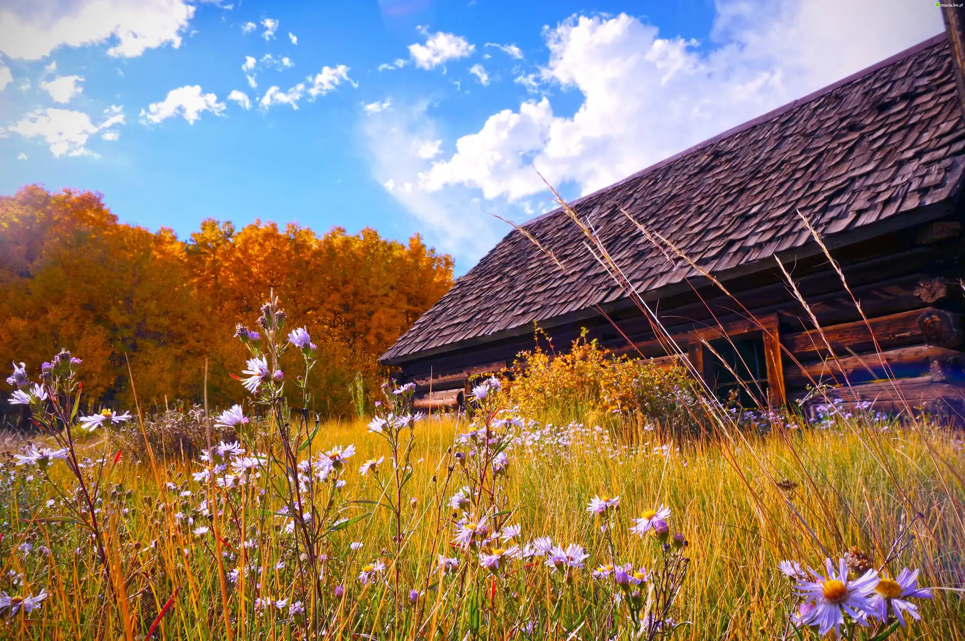 Zdjęcie Łąka, Kwiaty, Trawa, Stara, Drewniana, Chatka