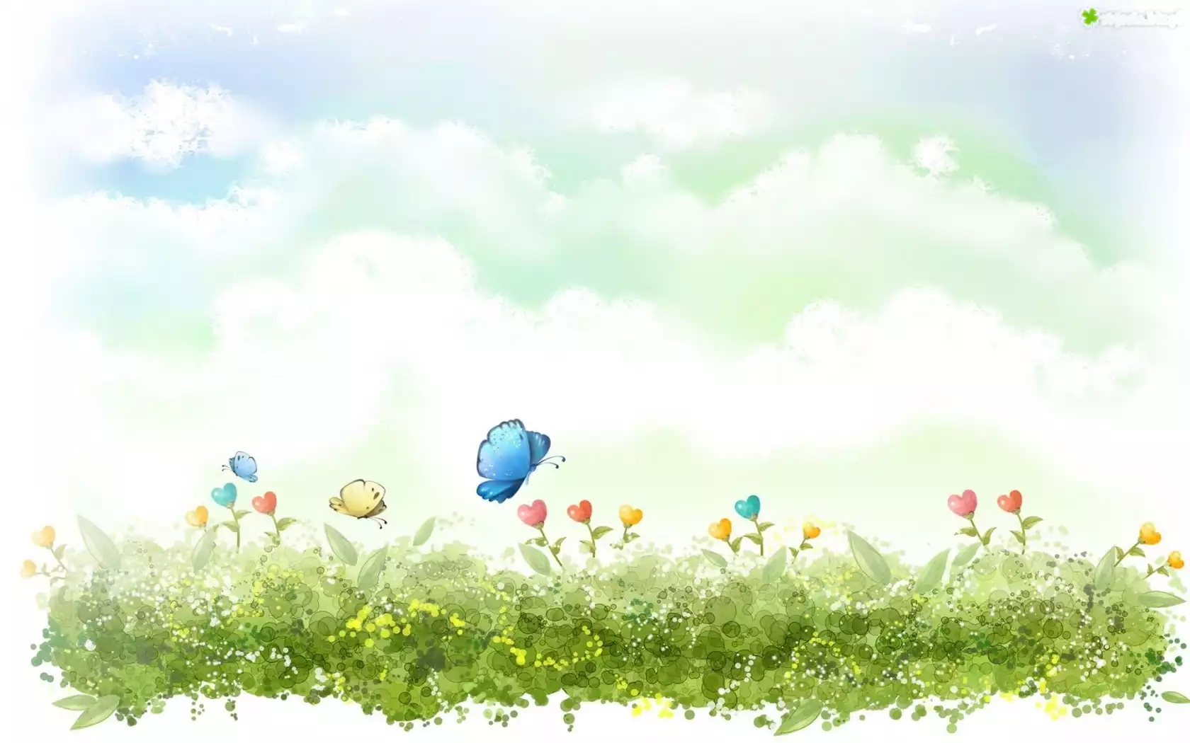 Zdjęcie Łąka, Kwiaty, Serca, Motyl, Chmury, Grafika