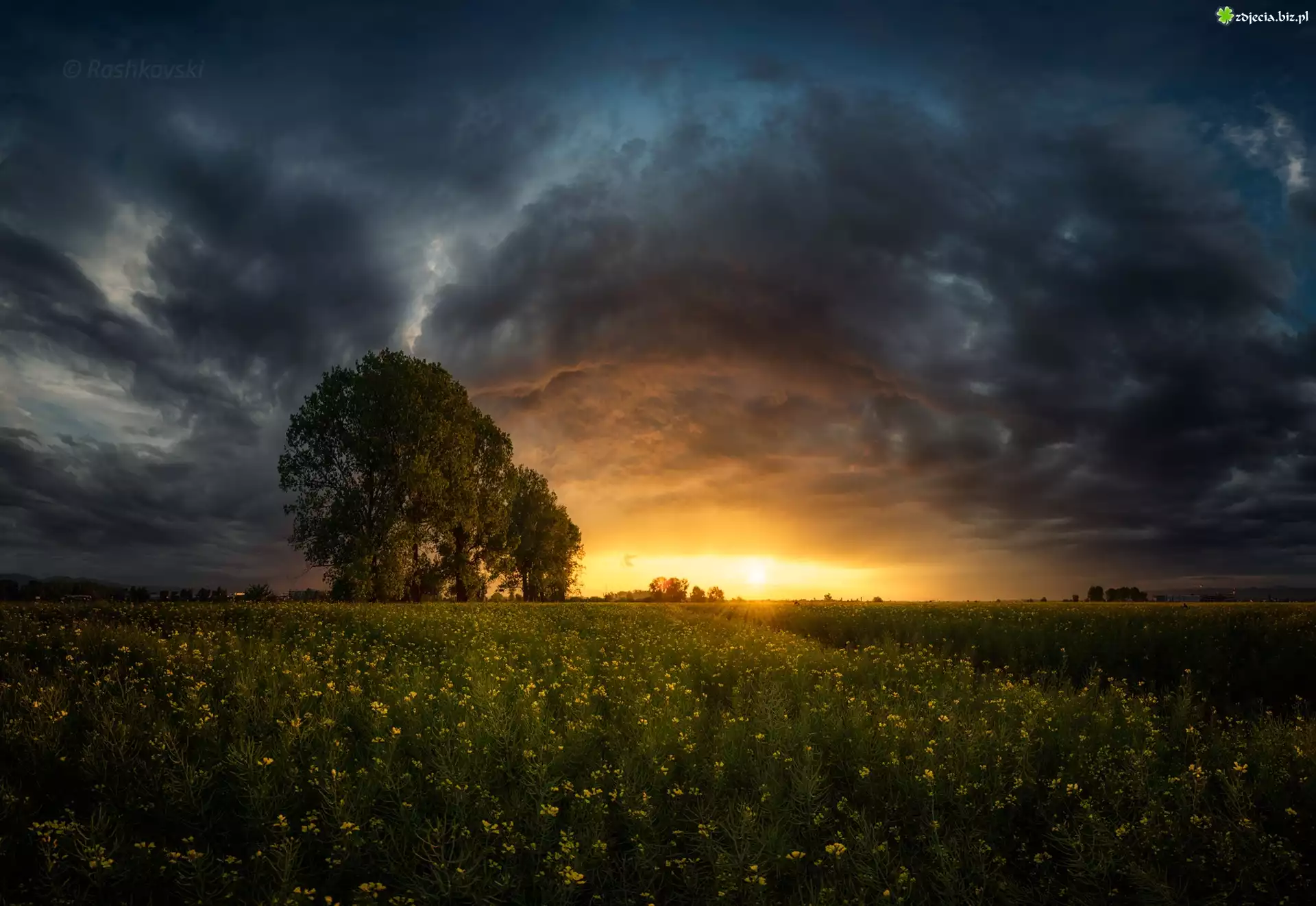 Zdjęcie Łąka, Kwiaty, Drzewa, Chmury, Zachód, Słońca