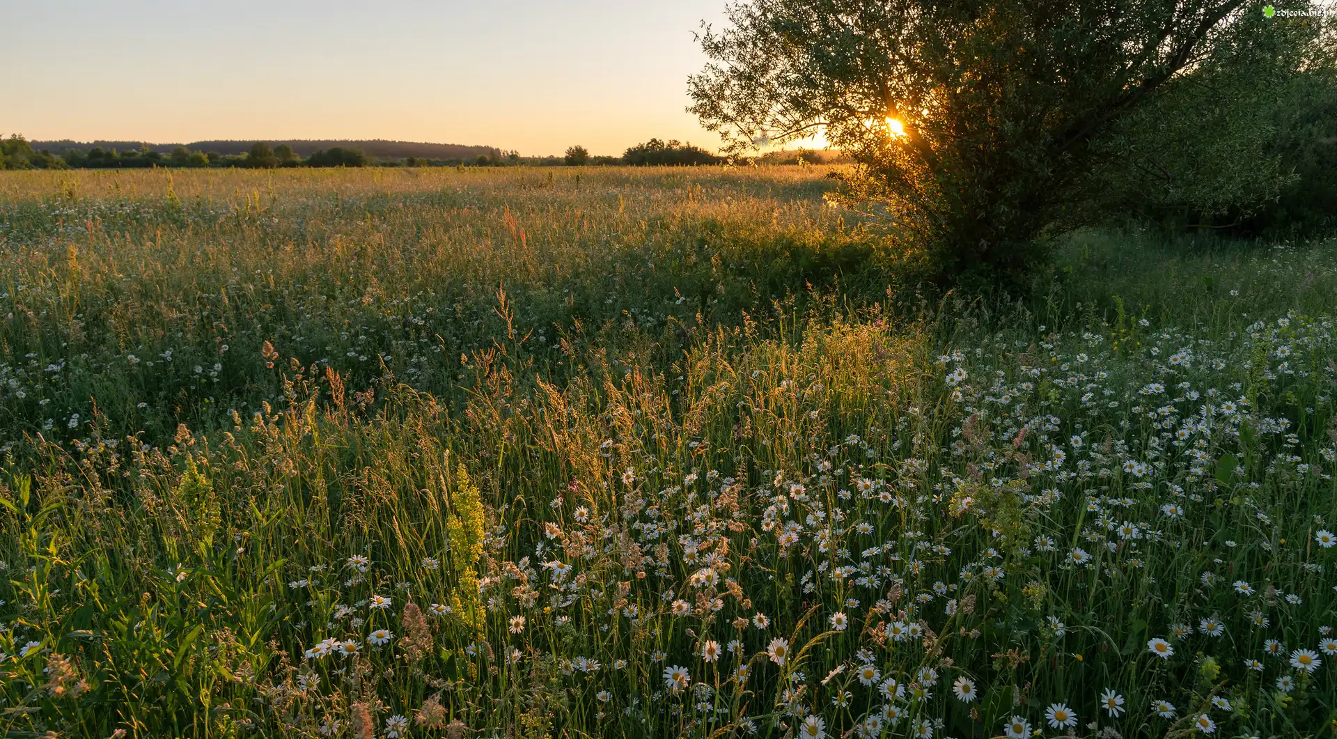 Zdjęcie, Łąka, Trawa, Margerytki, Drzewa, Zachód słońca