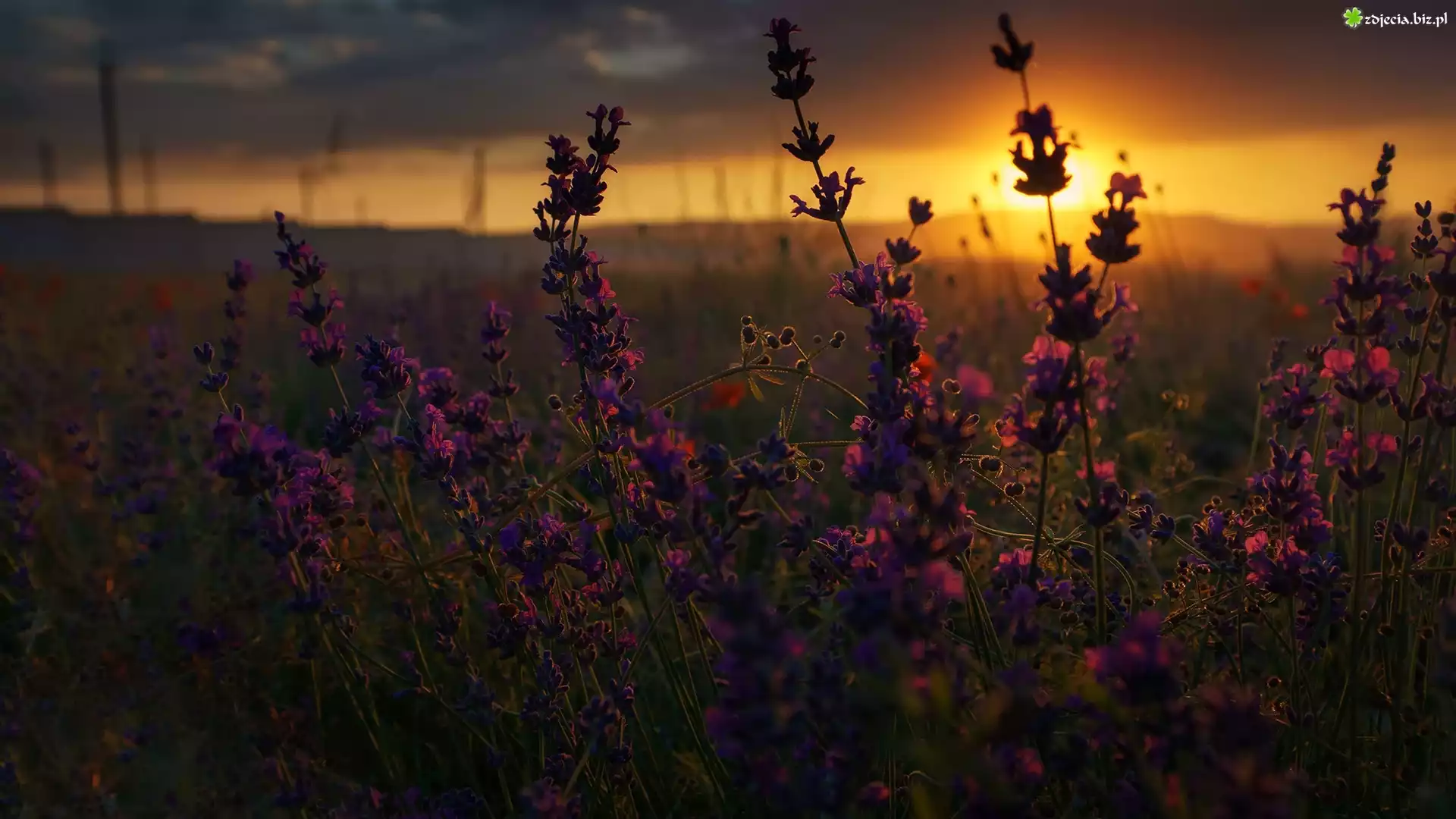 Zdjęcie Łąka, Kwiaty, Lawenda wąskolistna, Zachód słońca