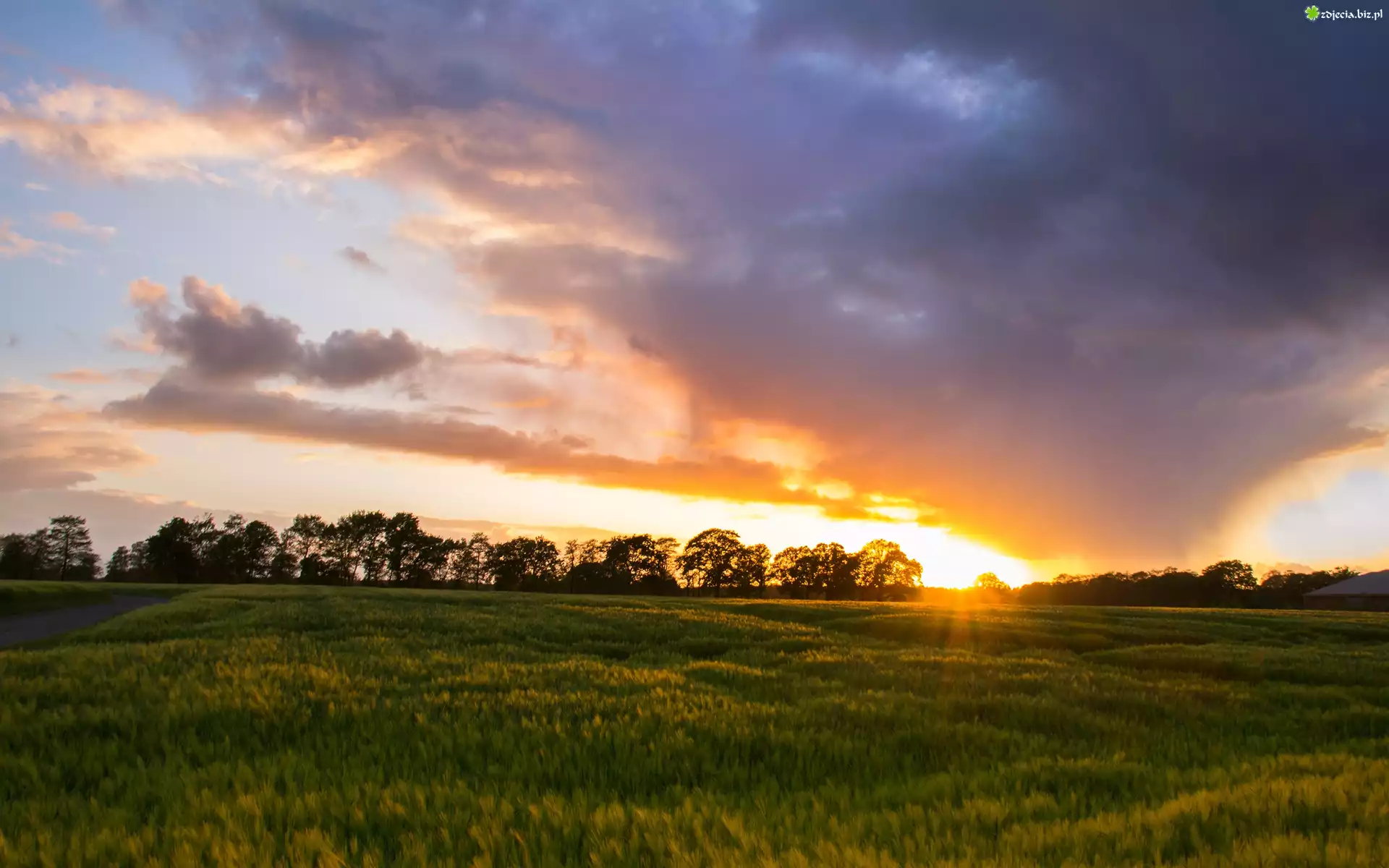 Zdjęcie Łąka, Wschód słońca, Droga, Drzewa, Niebo, Chmury