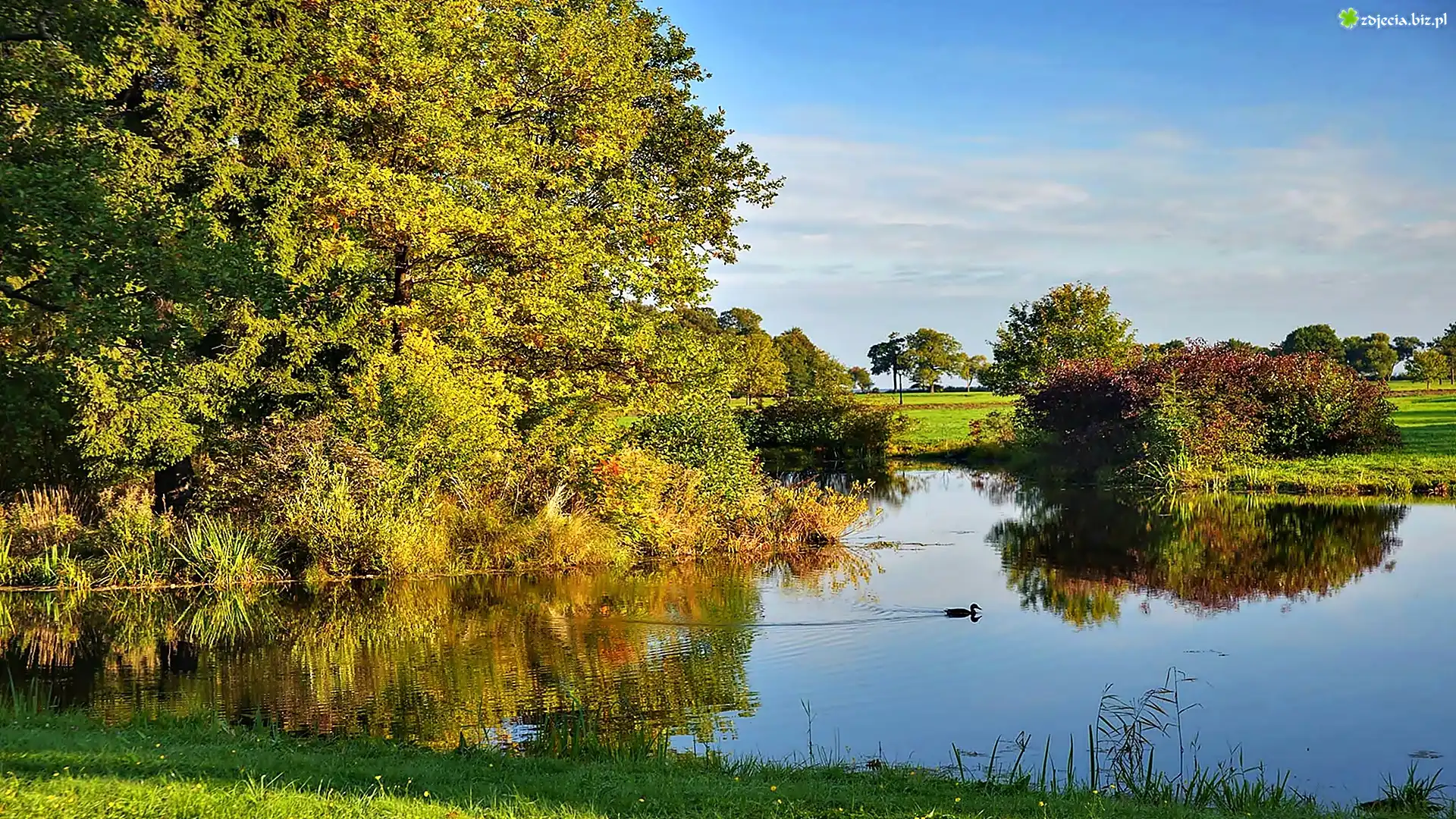 Zdjęcie Drzewa, Łąka, Jezioro, Kaczka, Przebijające, Światło, Odbicie