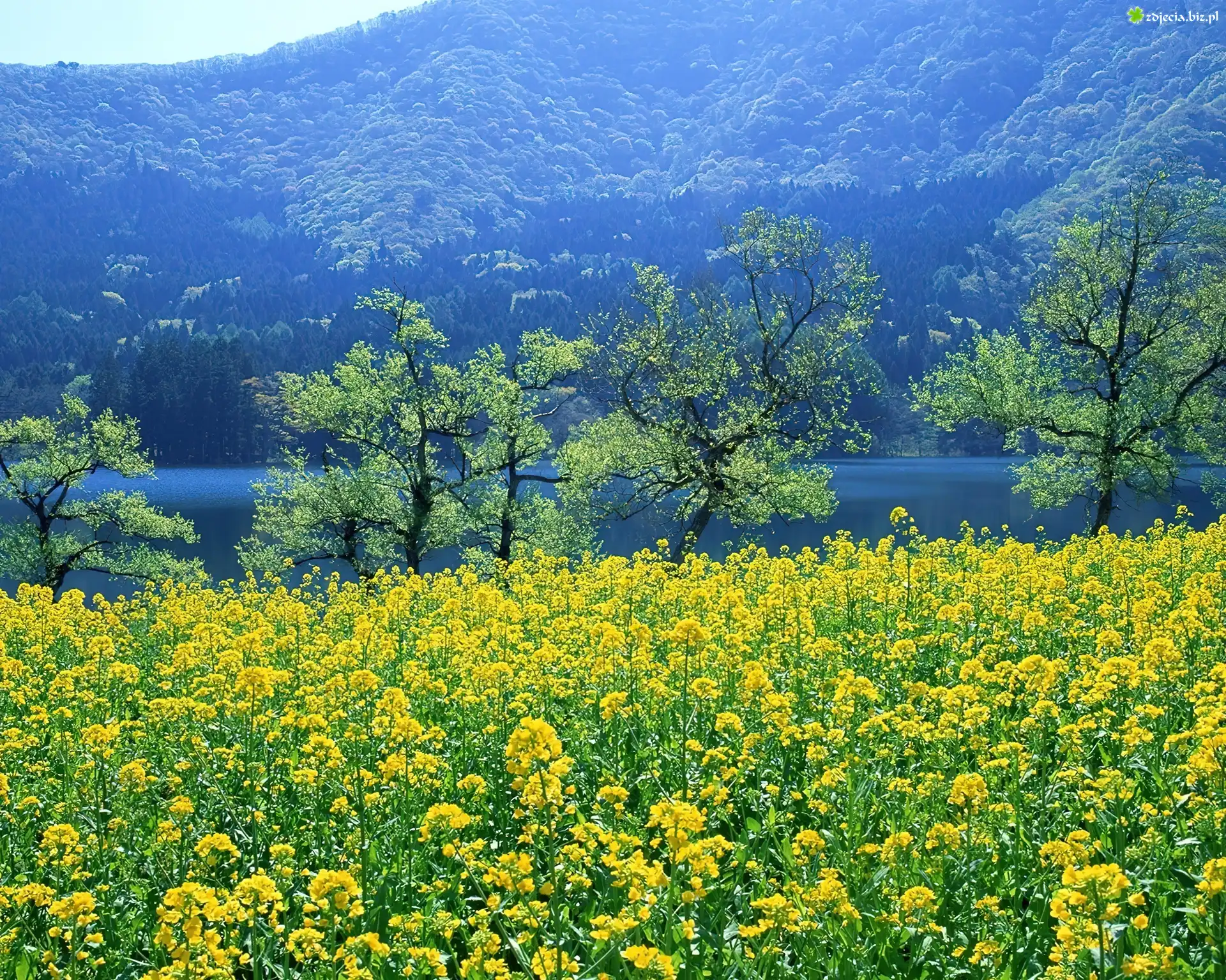 Zdjęcie Drzewa, Łąka, Kwiatki, Trawa, Jezioro, Góra, Wysokość