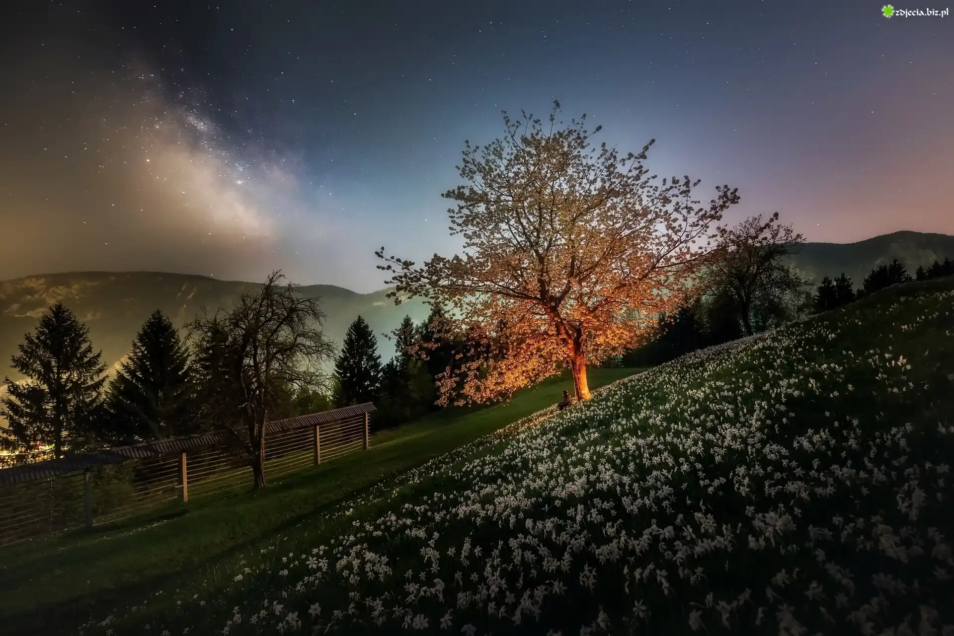 Zdjęcie Pagórek, Łąka, Kwiaty, Kwitnące, Drzewo, Płot, Góry, Gwiazdy