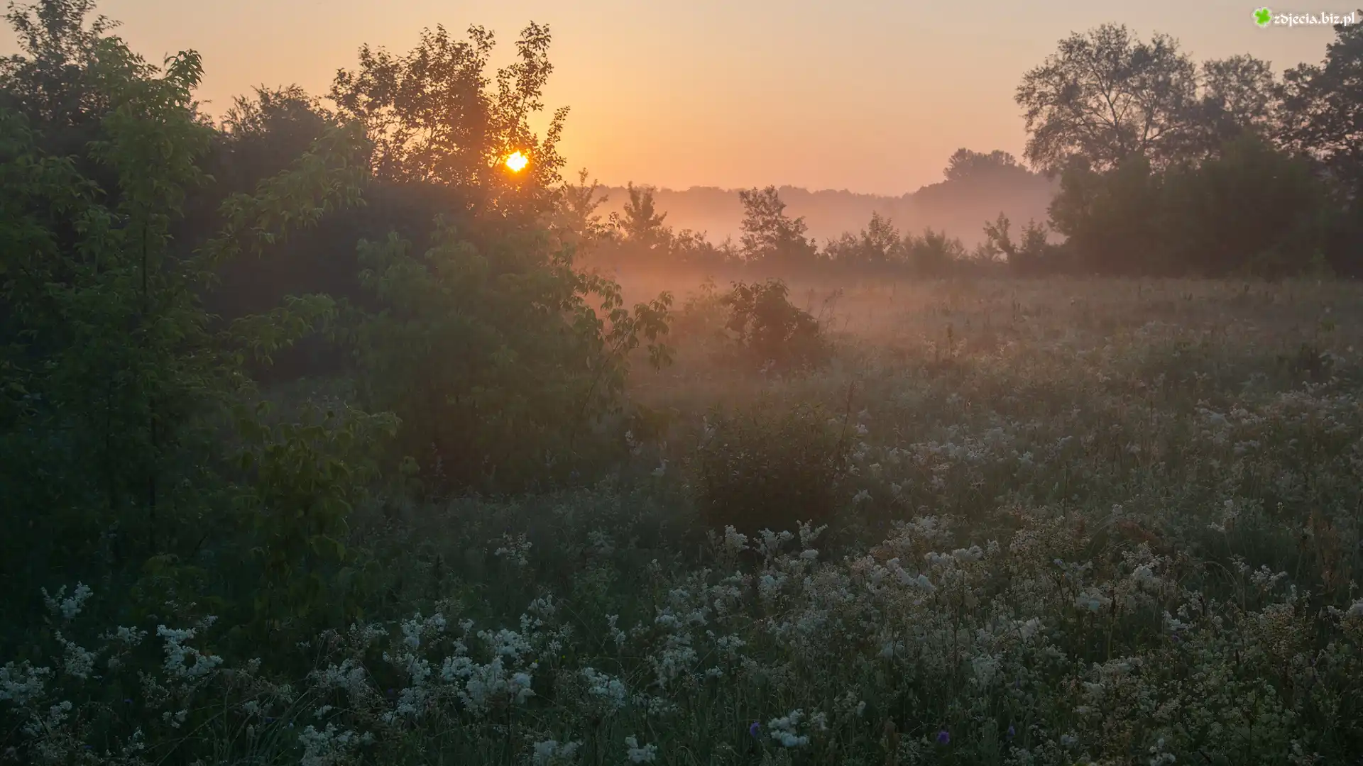 Zdjęcie Łąka, Drzewa, Kwiaty, Trawa, Mgła, Wschód słońca