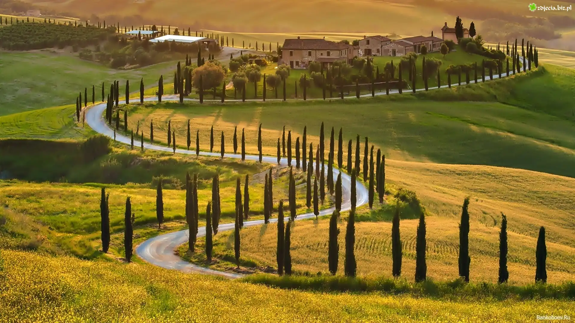 Zdjęcie Pola, Łąki, Kręta, Droga, Drzewa, Wieś, Toskania, Włochy