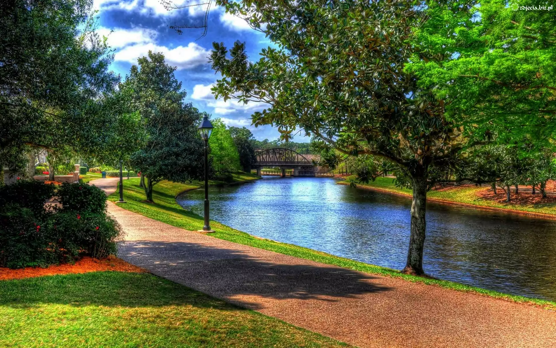 Zdjęcie Park, Aleja, Rzeka, Most, Obłoki, Przebijające, Światło