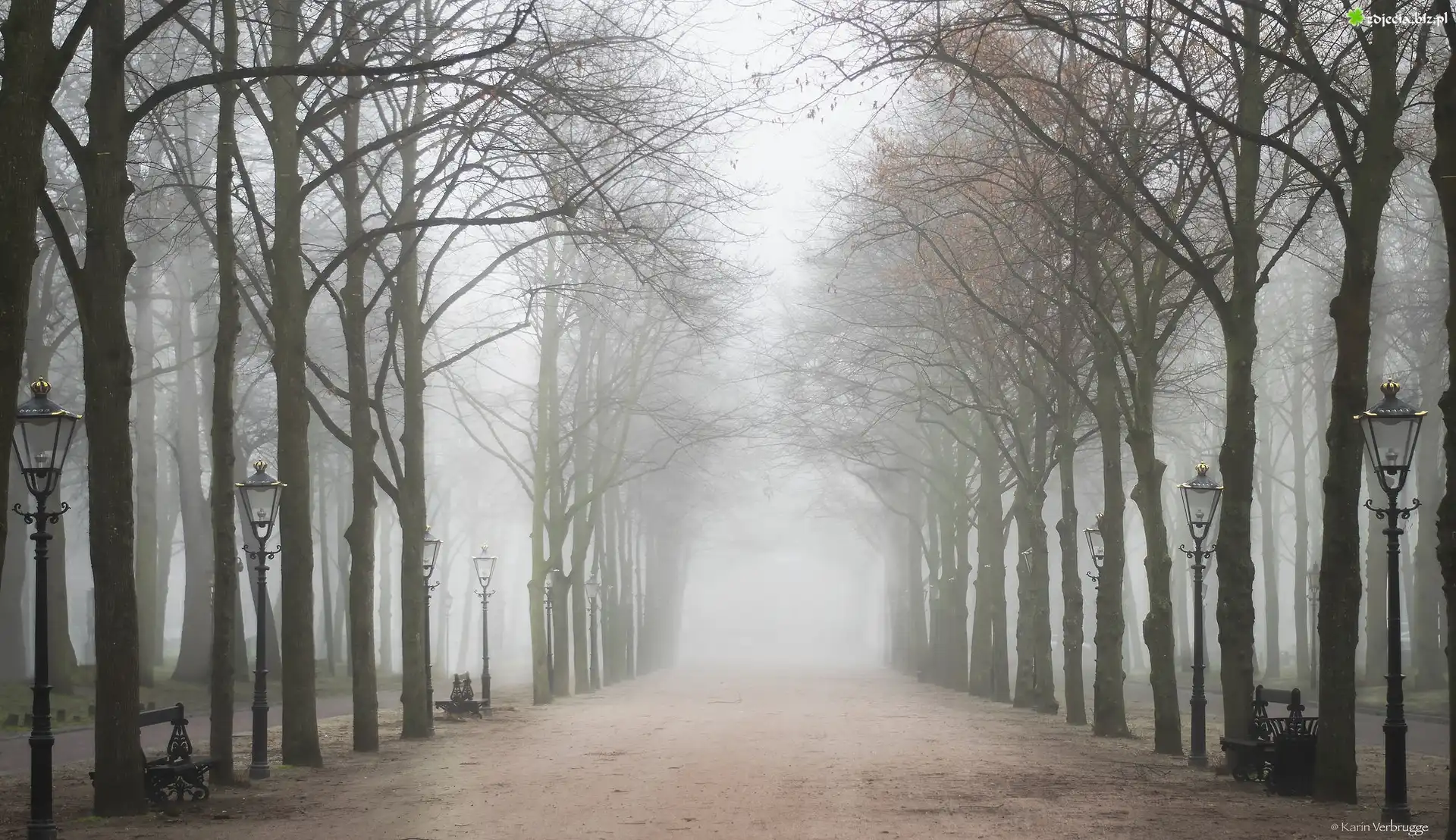 Zdjęcie, Park, Alejka, Mgła, Drzewa, Szpalery, Ławki, Latarnie