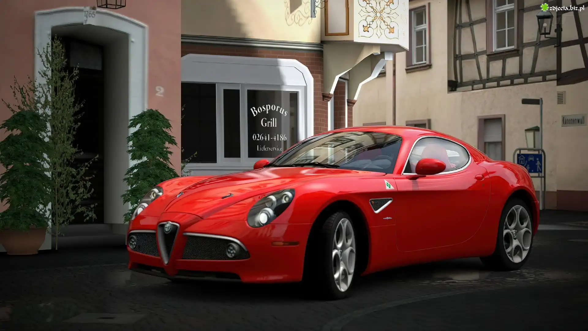 Alfa Romeo 8C Kompetizione, Ulica, Ahrweiler, Gran Turismo5 Alfa Romeo 8C, Okrągłe, Lampy, Tylne Alfa Romeo 8C Competizione Alfa Romeo, Czerwony, Samochód, Droga Alfa Romeo 8C Kompetizione Alfa Romeo 8C Zabytkowy, Alfa Romeo, 8C Alfa Romeo 8C, Mille Miglia Alfa Romeo 8C Competizione, Halogeny, Szyba Alfa Romeo Spider, 8C Alfa Romeo 8C, Lewy Profil Alfa Romeo 8C, Piękny, Widok