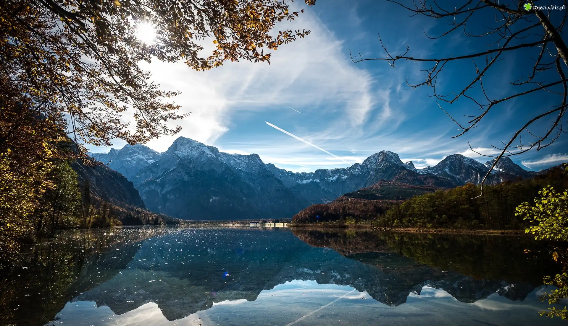 Zdjęcie Austria, Góry, Alpy, Dolina Almtal, Jezioro Almsee, Drzewa, Promienie słońca, Chmury