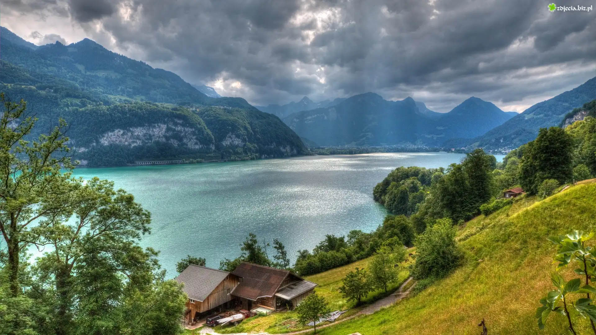 Zdjęcie Szwajcaria, Góry Alpy, Pasmo górskie Churfirsten, Jezioro Walensee, Domy, Drzewa, Chmury