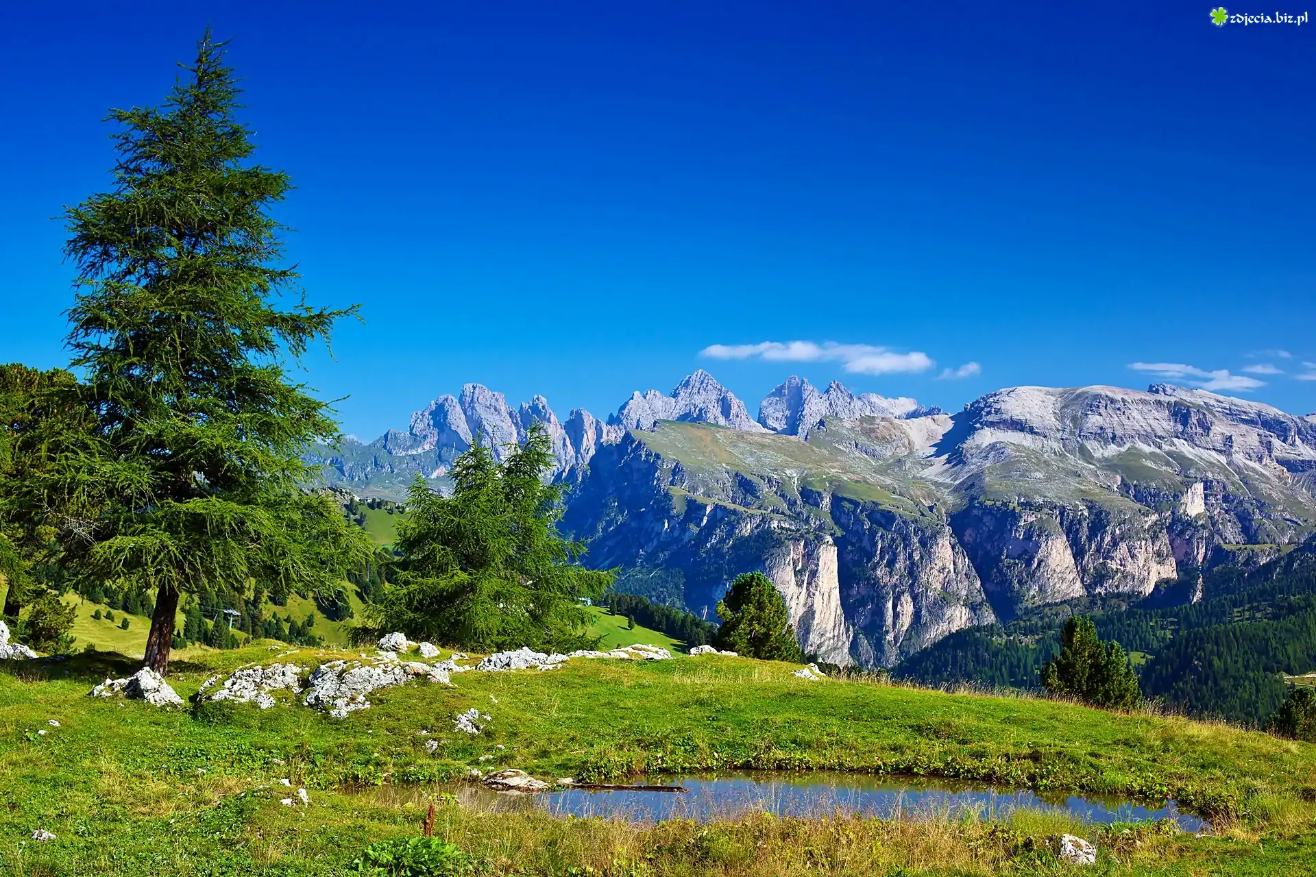 Zdjęcie Alpy, Włoskie, Lasy, Łąka, Jeziorko, Świerki