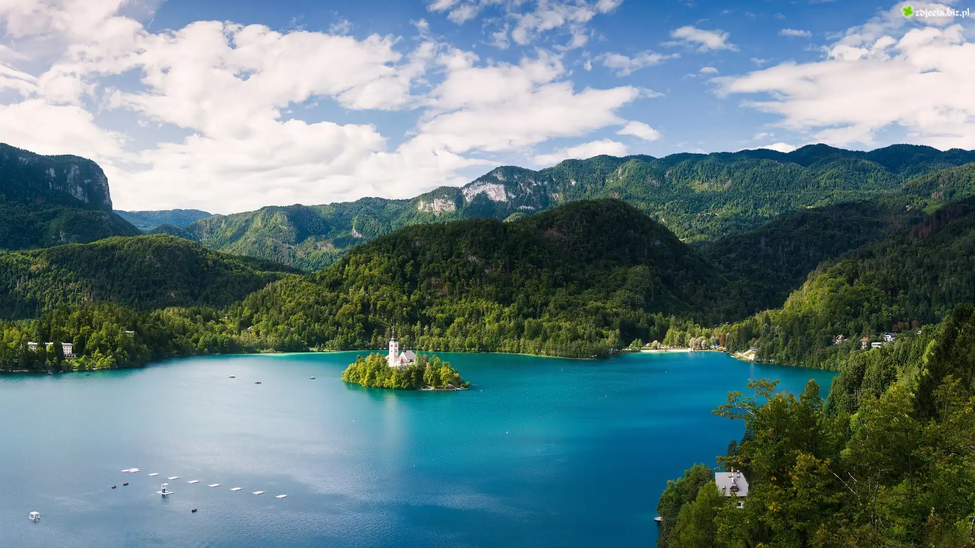 Zdjęcie Słowenia, Góry Alpy Julijskie, Jezioro Bled, Wyspa Blejski Otok, Drzewa, Chmury