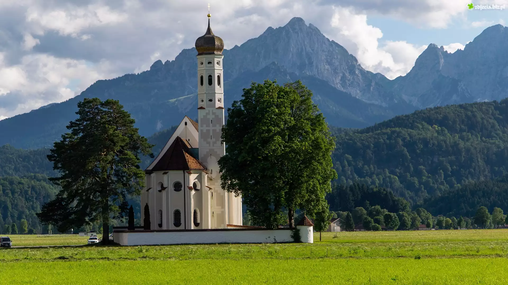 Zdjęcie Kościół, Eglise Saint Coloman, Góry Alpy, Las, Drzewa, Miejscowość Schwangau, Bawaria, Niemcy |