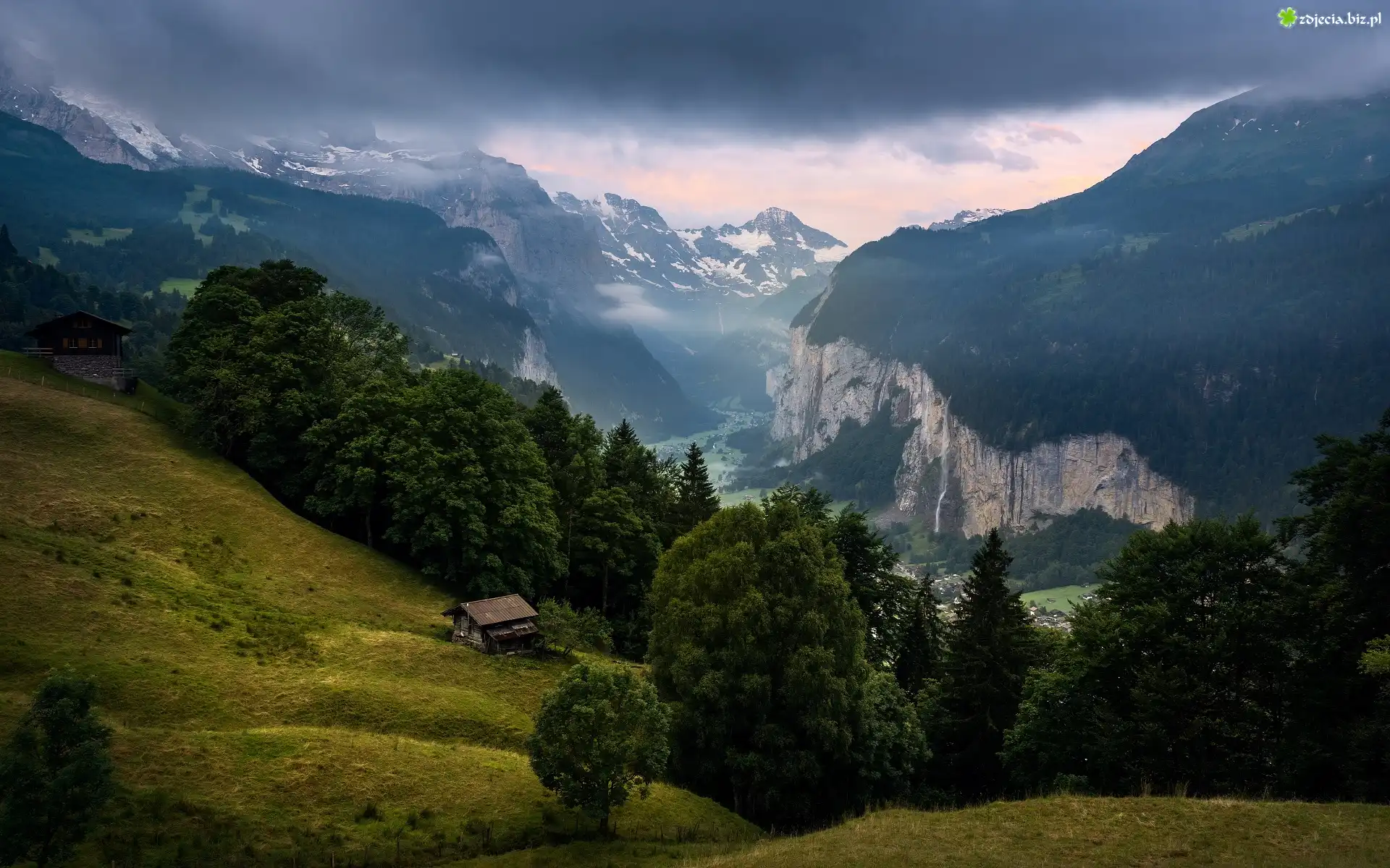 Zdjęcie Szwajcaria, Gmina Lauterbrunnen, Wengen, Góry, Alpy Berneńskie, Dolina Lauterbrunnen, Lasy, Drzewa, Domy |