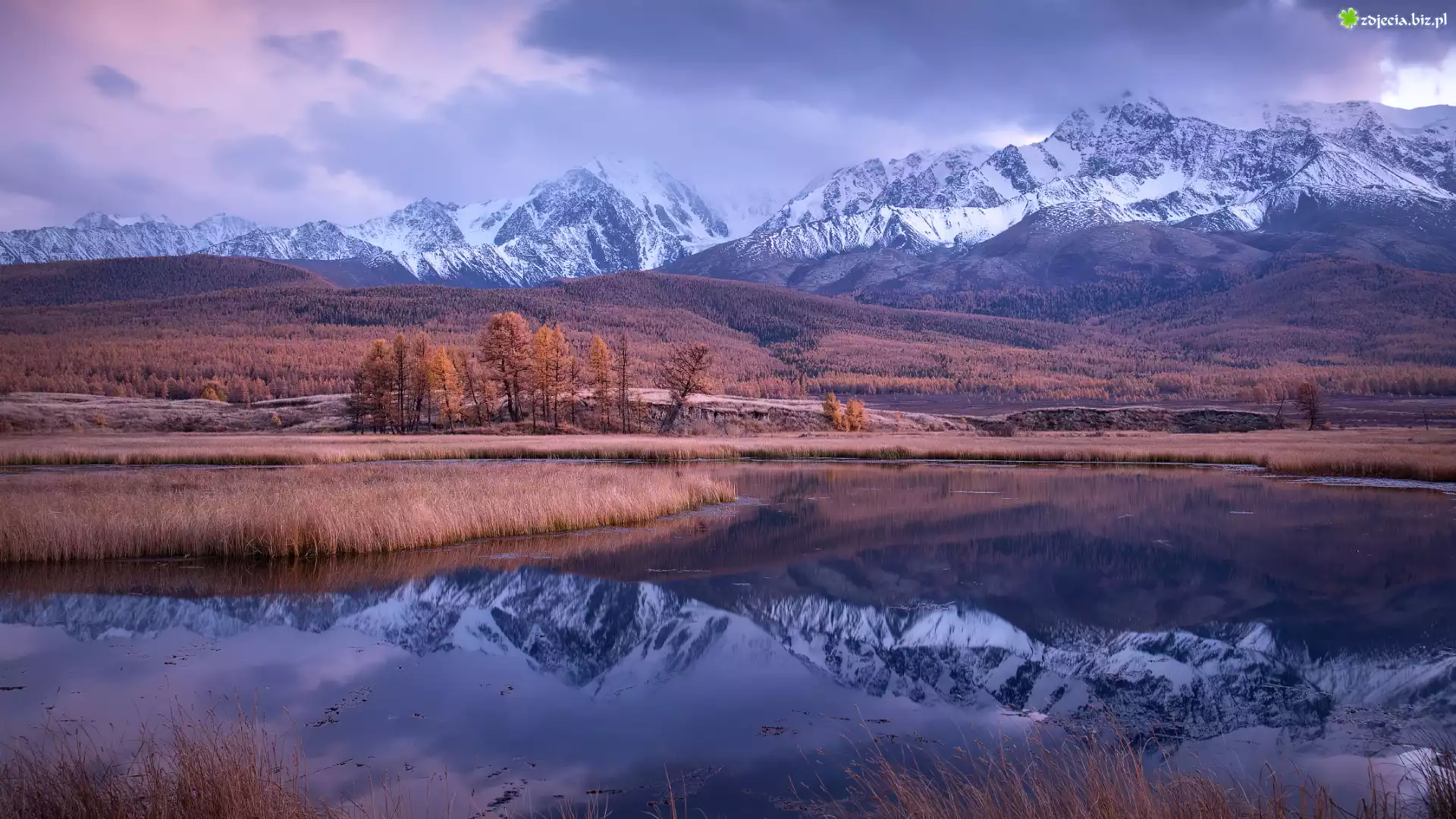 Zdjęcie Góry Północnoczujskie, Ośnieżone, Szczyty, Drzewa, Jezioro Dzhangyskol, Rosja, Ałtaj